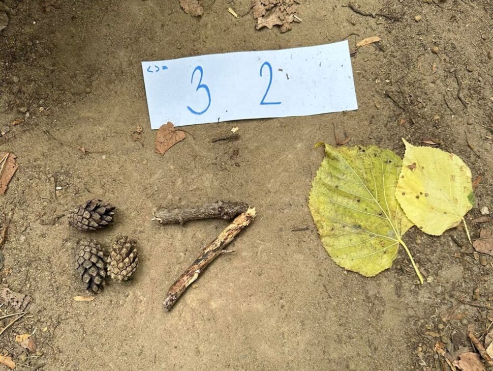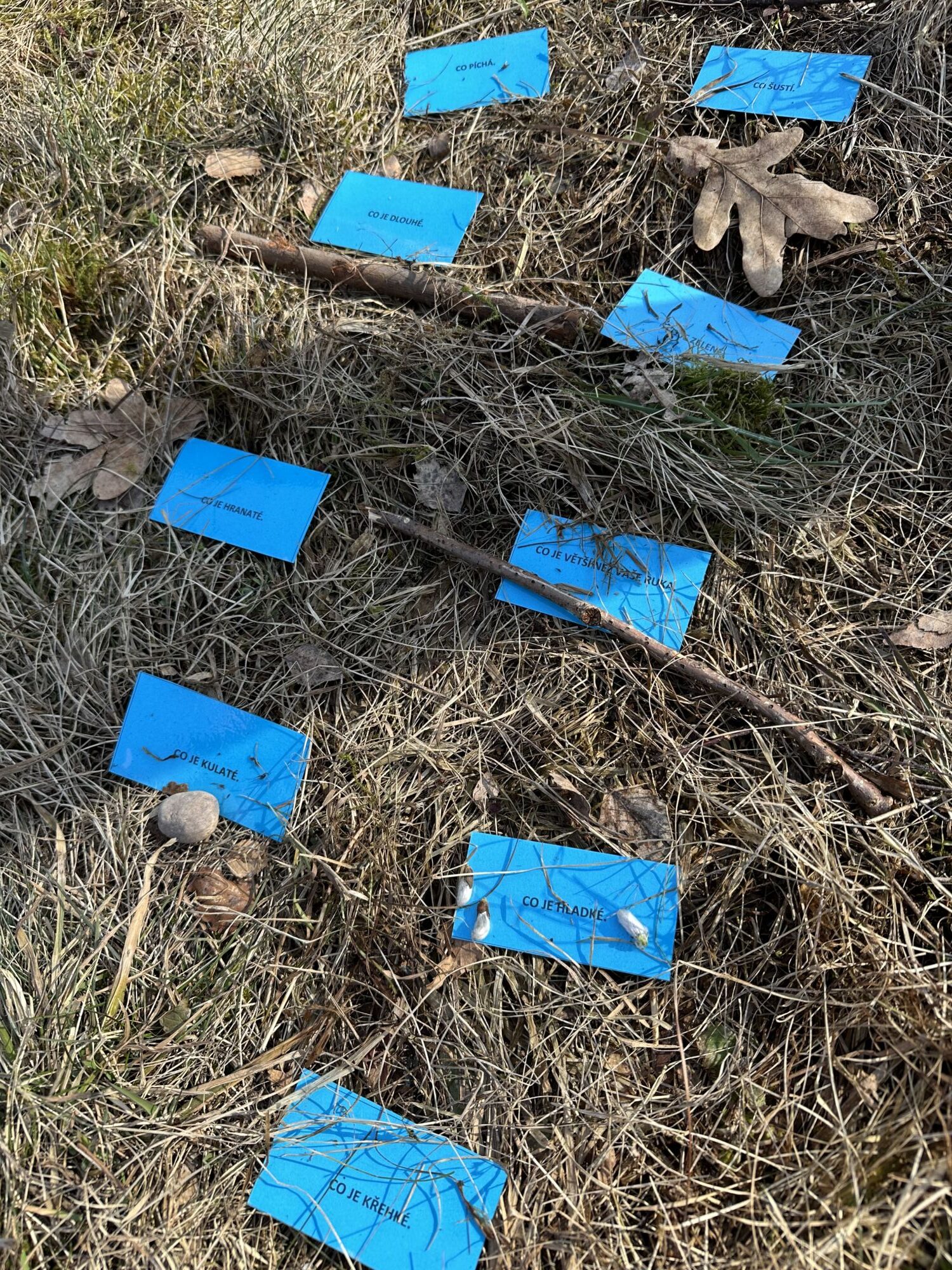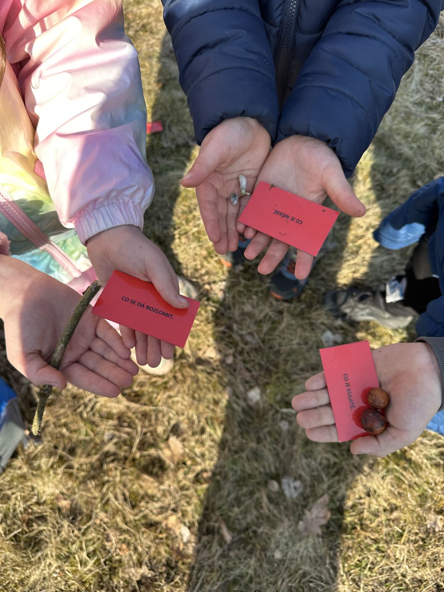Potom jsme vyrazili a cestou už děti vnímaly okolí úplně jinak. Sbíraly, hledaly, porovnávaly – každá skupina objevovala to své. Když jsme dorazili do cíle, což bylo malé zázemí u lesa, rozložily si kartičky a přiřadily k nim nalezené „poklady“. Společně jsme si pak jednotlivé věci představili a povídali si o tom, co koho nejvíc zaujalo, co bylo nejtěžší najít, co nejzajímavější, nebo čím se skupinky od sebe lišily.