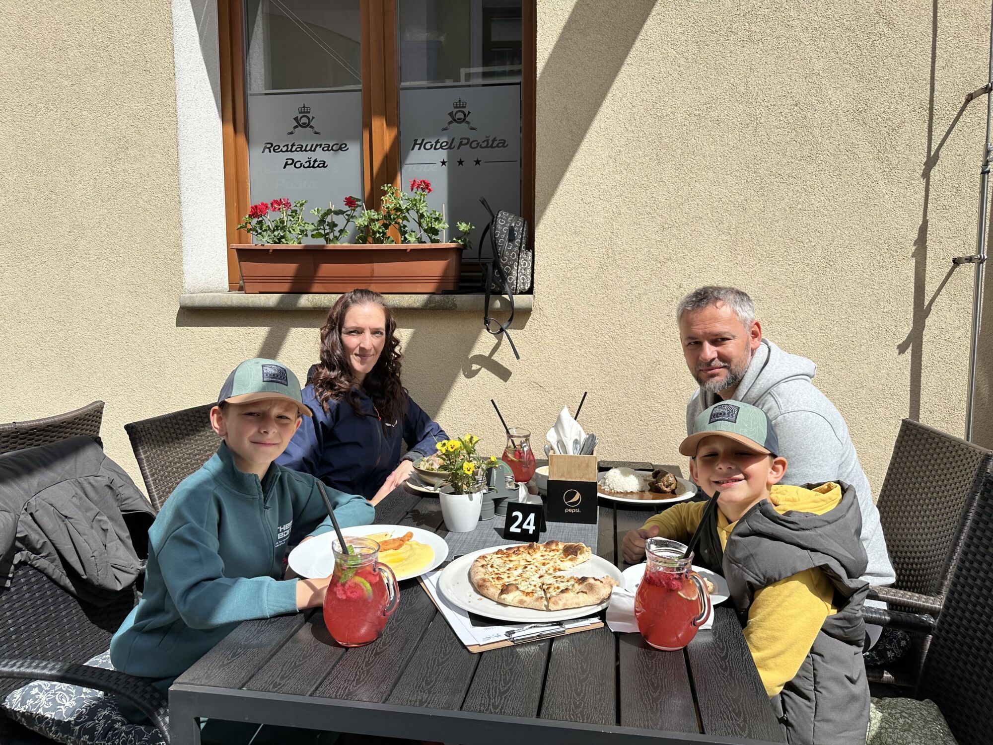 Výlet jsme začali v Sobotce, kde jsme nechali auto na náměstí. Než jsme vyrazili na trasu, zastavili jsme se ještě na oběd v restauraci Pošta. Do této restaurace se rádi vracíme – mají chutná jídla různého zaměření, krásné posezení uvnitř i venku a dětský koutek, který potěší každého malého výletníka. Obsluha je rychlá a ochotná, takže jsme si mohli v klidu vychutnat jídlo a naladit se na klidnější tempo dne.