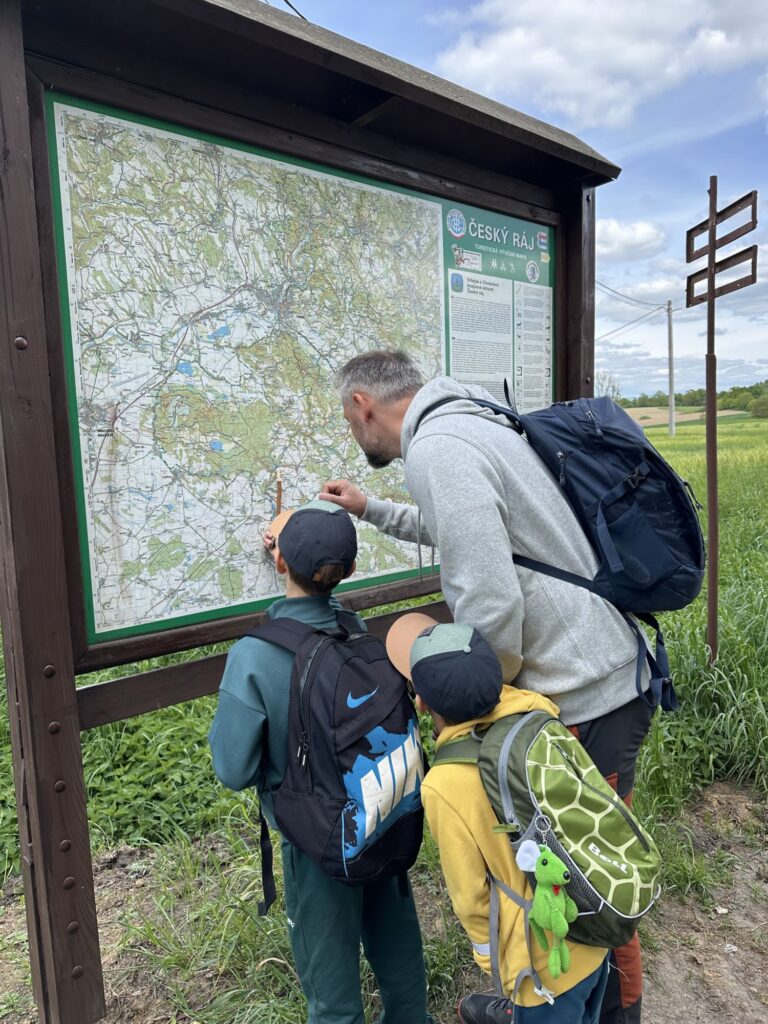 Trasa po žluté značce byla po celou dobu velmi dobře značená, takže jsme se mohli v klidu nechat vést a soustředit se na vnímání okolí. Cestou jsme narazili i na jednu velkou mapu Českého ráje, u které jsme se na chvíli zastavili. Byla to ideální příležitost ukázat klukům, kde právě jsme a kam míříme.