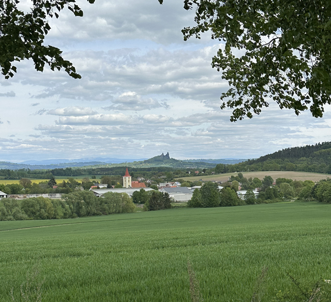 Cesta vedla převážně mezi poli a loukami, jen krátký úsek jsme šli po klidnější silnici. I když jsme po trase nenarazili na žádné naučné tabule, o pozorování a objevování rozhodně nebyla nouze. Příroda si tu vystačila sama. V jednu chvíli se před námi otevřelo panorama s výhledem na Trosky – opravdu nádherný pohled, u kterého si člověk skoro až říká, že kdyby měl být někde první romantický piknik nebo rande, bylo by to přesně tady. 🙂 Na tom místě stála i dřevěná lavička – úplně vybízela k tomu, se na chvíli zastavit, ztišit se a jen tak být.