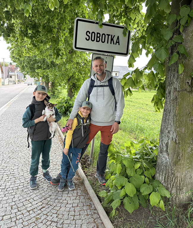 Jak cesta ubíhala, únava u kluků začínala být znát. Nejvíc v místech, kde se šlo po silnici – i když nebyla vůbec rušná, působila na děti asi o něco delším dojmem. V dálce se občas objevil zámek Humprecht, ale klukům už to připadalo nekonečné. Měli pocit, že do Sobotky snad nikdy nedojdeme. 😀